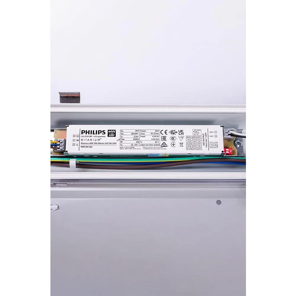 4 Leistungsstufen (100/85/70/55%) über DIP-Schalter einstellbar, hervorragendes Lumen/Watt-Verhältnis von bis zu Ø180lm/W, Gehäuse PC grau, Abdeckung PC opal mit Rillenoptik, Schlagschutz IK08, mit Marken-Vorschaltgerät von "Philips" und Steckklemmen, einfache Montage, da LED-Trägerplatine in der Abdeckung fixiert ist und bei der Montage nicht separat herausgenommen bzw. wieder eingesetzt werden muss, Abstrahlwinkel 160° (Nennwinkel 110°), mit Durchgangsverdrahtung 3x1,5mm², Montagewinkel und Klammern aus Edelstahl, mit mehreren Einspeisemöglichkeiten (auch Mitteleinspeisung möglich) und 2 Kabelverschraubungen, hohe Lebensdauer >50.000 Stunden (L90 B50), Betriebstemperatur -20°C bis +40°C, D, BEG-förderfähig, Garantie 5 Jahre