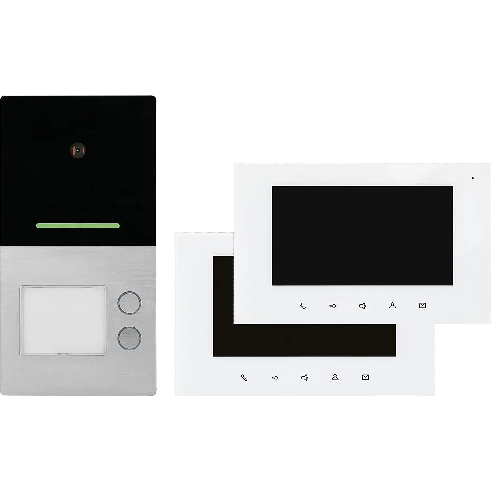 2-Draht-Technik, Video-Set mit Villa Aufputz Video-Türstation und Hausstation 7" Farbmonitor Villa M weiß, mit Wandhalterung für die Installation auf Schalterdose, Freisprechfunktion, Rufton ausschaltbar, für Parallelbetrieb geeignet, Anschluss von Etagentaster potentialfrei, Ruftonlautstärke einstellbar, unterschiedliche Klingeltöne, Helligkeit und Kontrast veränderbar, Bildaufnahme mit automatischem Screenshot über internen Speicher, SD Kartenslot für Micro-SDHC Karte bis zu 32GB für Videoaufnahmen, Spannungsversorgung 30V-DC, Maße 220x140x24mm, Türstation mit Aluminiumgehäuse, Bildauflösung 1 MP, mit beleuchtetem Namensschild, Türöffnerkontakt potentialfrei für externe Spannungsversorgung 30V DC/12V AC mit einstellbarer Schaltzeit 1-10 Sekunden, Anschlussmöglichkeit eines externen Türöffnertasters oder Codeschlosses, LED-Rufanzeige, Rufquittierung über LED-Leiste, Maße 192x100x22mm, IP54, Netzgerät Villa NG, für Verteilereinbau, Eingang 230V-AC, Ausgang 30V-DC für Busleitung, Status LEDs, 144x90x64mm