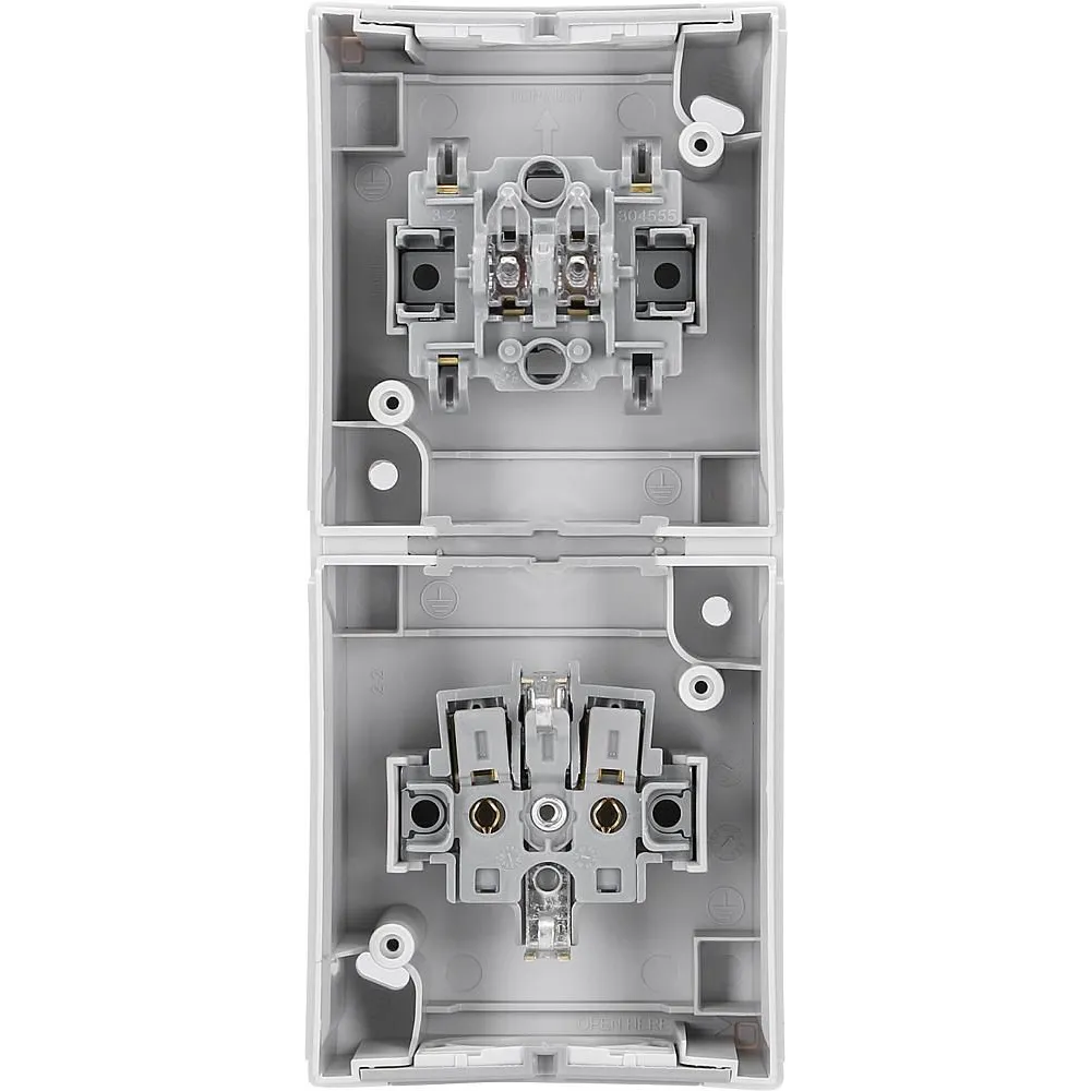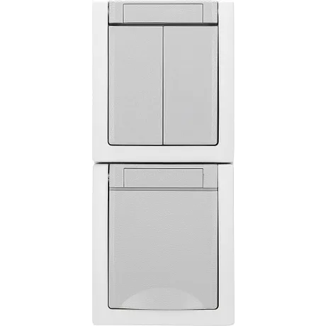 Gehäuse grau - Wippen und Klappdeckel dunkelgrau, Einsätze mit Steckklemmen als Verbindungsklemme für den Anschluss von starren Leitern bis 2,5mm² , robustes Gehäuse aus glasfaserverstärktem Thermoplast, schlagfest gem. IK 05 mit chemischer und thermischer Beständigkeit, großem Anschlussraum und Durchschleifmöglichkeit, Aufnahmemöglichkeit von Beschriftungs-Set, Weichmembraneinführungen unten und oben, durch Modulbauweise Einsätze von waagerechten und senkrechten Kombinationen austauschbar, halogenfrei, VDE, IP54